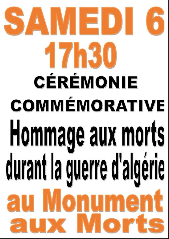 Samedi 6 décembre en fin d’après-midi. 17h15 : Rassemblement 17h30 Cérémonie commémorative et dépôt de gerbe Cérémonie commémorative devant le monument aux morts en mémoire « des Morts pour la…